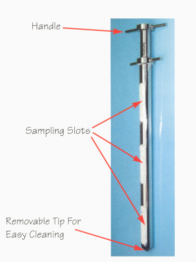 The samplers are quick and easy to operate. Just insert the sampler into the product to be sampled, turn the handle to open the slots, turn the handle to close the slots, and remove the sampler. The sample is removed from the sampler by inverting the sampler.
